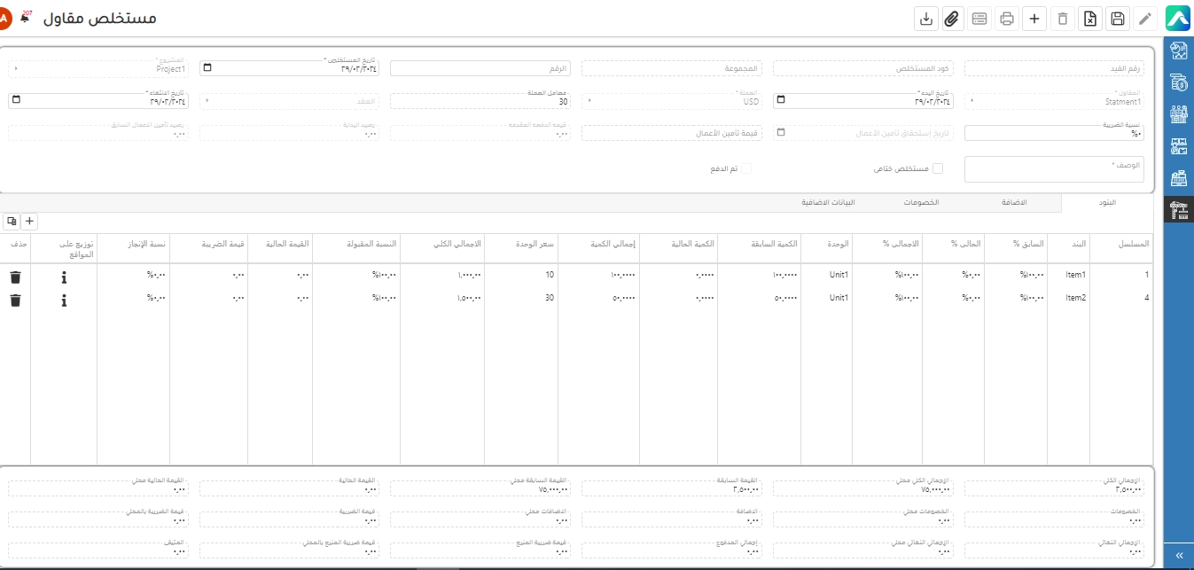 يمكن إنشاء المستخلص يحتوي على خصومات (قابلة للرد أو ضريبة منبع أو خاضع لضريبة القيمة المضافة)و يتم ظهور الخصومات التي تم اختيارها في شاشة المقاول