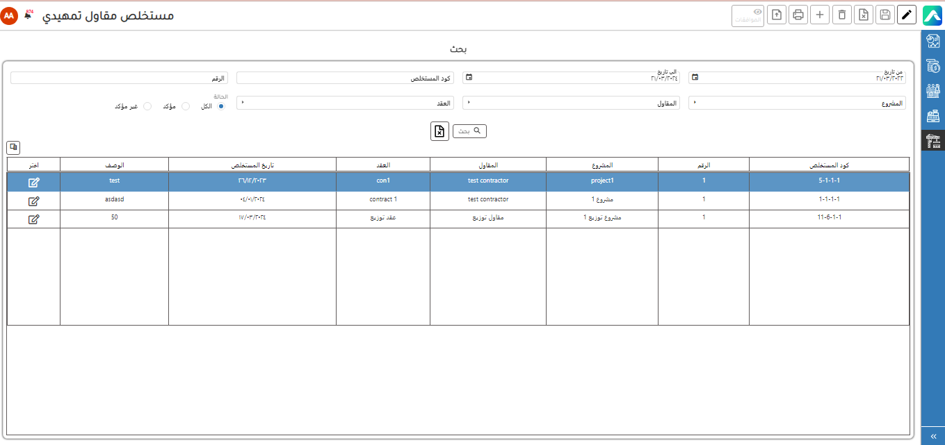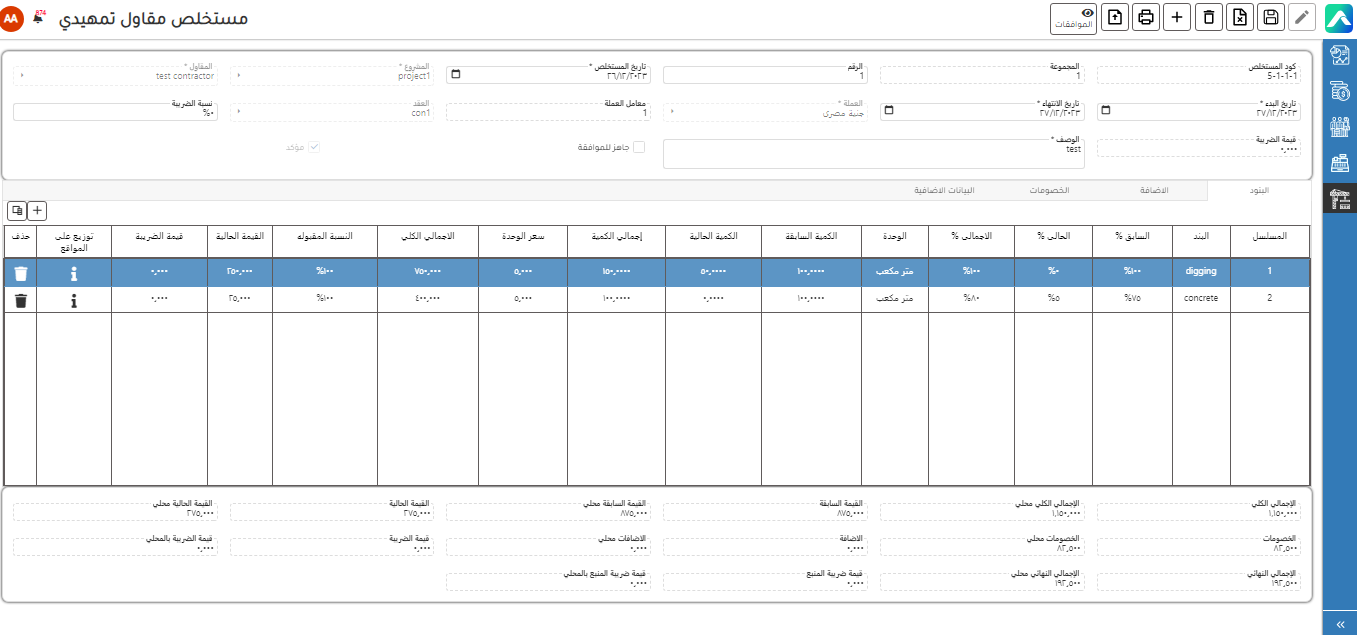 يتم إنشاء مستخلص تمهيدي و اختيار المشروع و المقاول و البنود و في حالة إنشاء أول مستخلص للمقاول مع المشروع يمكن كتابة نسب أو كميات سابقه و في حالة وجود عقد يتم اختيار العقد و يتم اختيار البنود الموجودة في العقد و امكانية تأكيد المستخلص و وجود موافقات