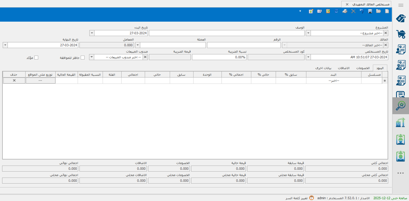 يتم إنشاء مستخلص تمهيدي و اختيار المشروع و المالك و البنود و في حالة إنشاء أول مستخلص للمالك مع المشروع يمكن كتابة نسب أو كميات سابقه و في حالة وجود تسعير معتمد يتم إظهار الكميات و الأسعار الموجودة في التسعير على مستوى البند و امكانية تأكيد المستخلص و وجود موافقات.