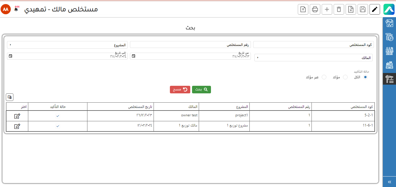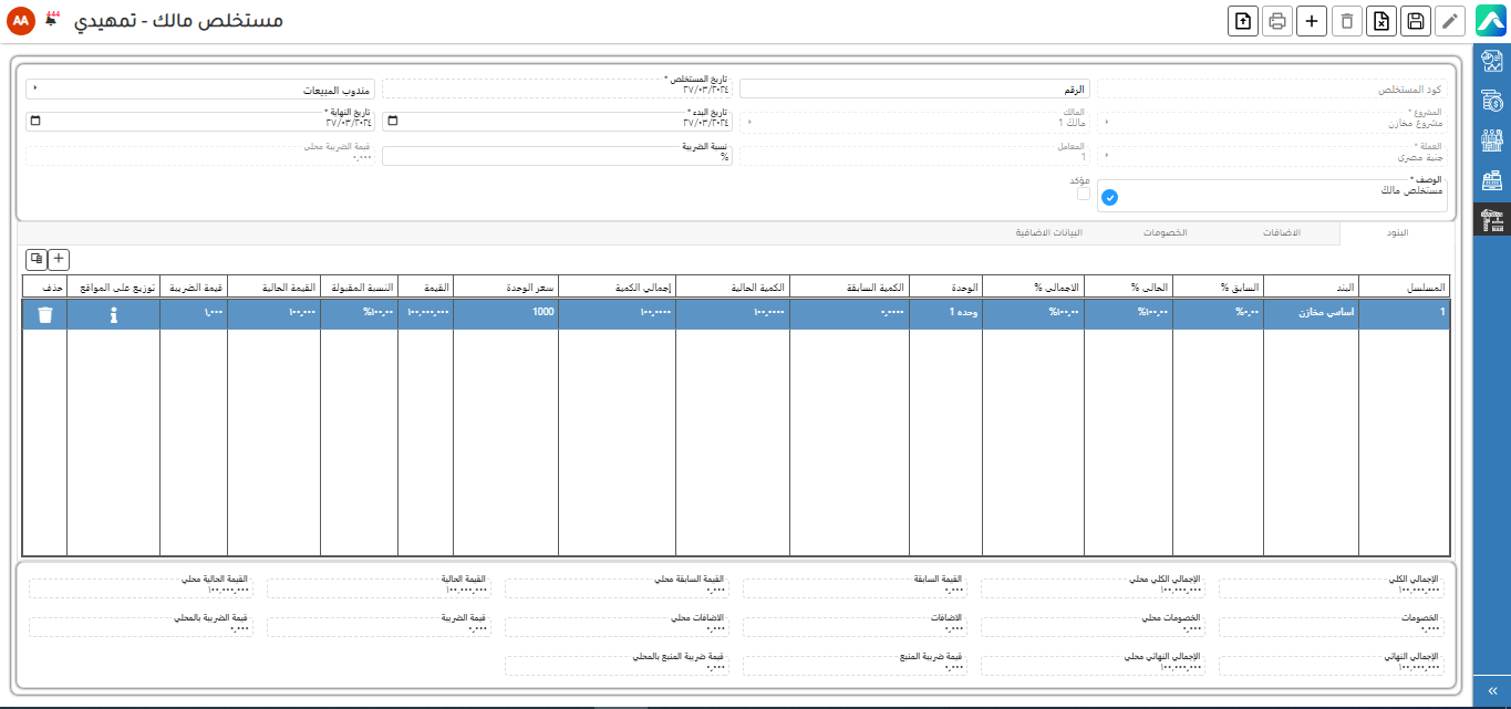 يمكن إنشاء المستخلص يحتوي على خصومات (قابلة للرد او ضريبة منبع او خاضع لضريبة القيمة المضافة)و يتم ظهور الخصومات التي تم اختيارها في شاشة المالك