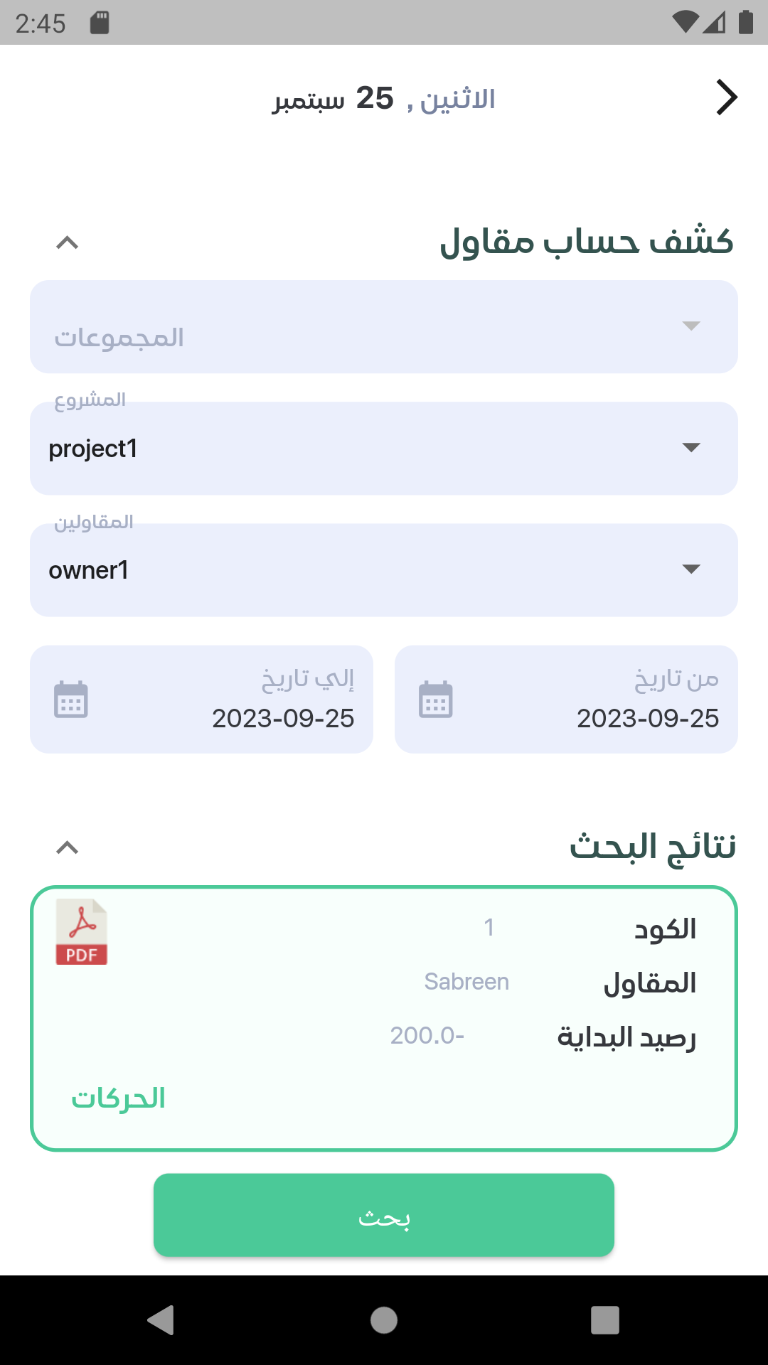 يظهر الحركات التي تمت علي حساب المقاول في فترة وهذه الحركات تشمل