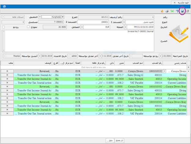 وبهذا نكون قد قمنا بعمل قيد إستحقاق مرتبات وسوف يقوم البرنامج بترحيل الحسابات الى حساب الأستاذ المساعد واليومية وعمل التسويات اللازمة. ثم بعد ذلك نقوم بطباعة القيد وإرفاق المستندات به ونقوم بحفظها بالترتيب حسب المسلسل أو كالسياسة المتبعة فى الشركة ونقم بالطباعة بالضغط على أيقونة شكل الطابعة الموجود بشريط المهام للقيد أو بالضغط على ctrl+p