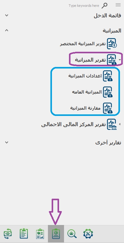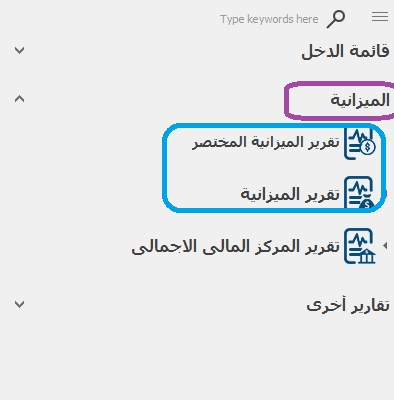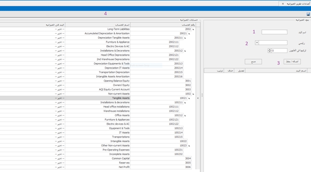 ومنها يمكن ترتيب بنود الميزانية وإضافة وحذف حسابات و يكون شكل الاعدادات كالتالى