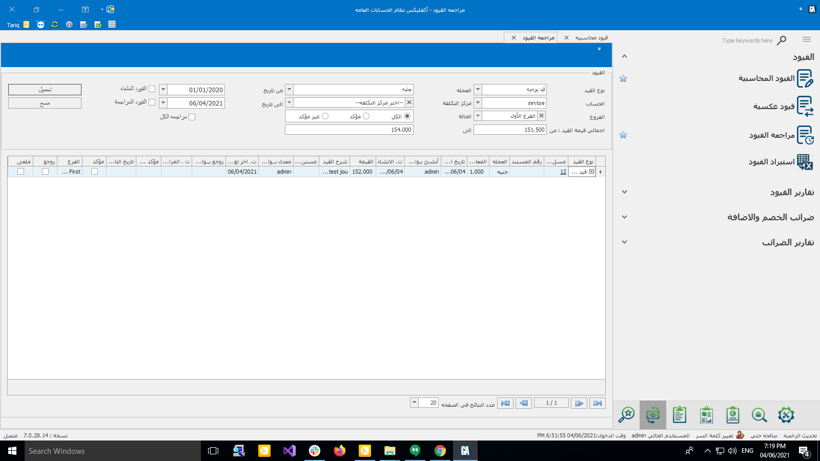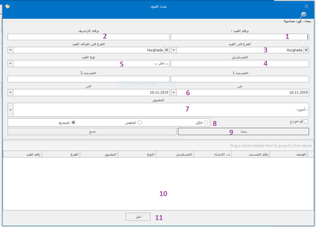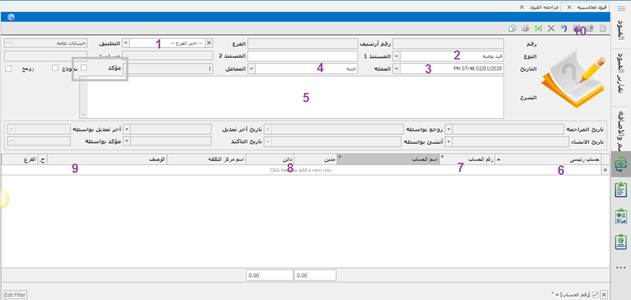 يتم من خلالها مراجعه القيود من مستخدم معين مثل المدير المالي ... و يتم مراجعه القيد من خلال فتح شاشة مراجعة القيود مع امكانيه البحث عن القيود بفرع معين او نوع قيد او حساب او عمله او مركز تكلفه او حالته اذا كان مؤكد او غير مؤكد او اجمالي القيد او الفتره ثم نضغط على تحميل سوف تظهر القيود
