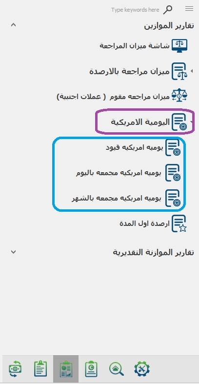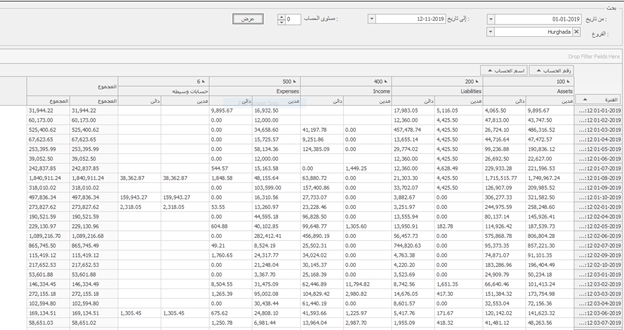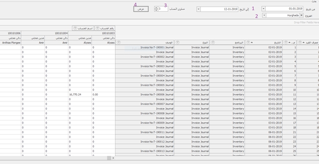 و فيها يتم البحث بالتاريخ تحديد الفرع ثم اختيار المستوى الحساب ثم عرض و بعدها ستظهر اليومية حسب مستوى البحث الذى أدخلته