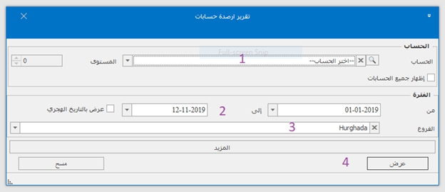 ادخال اسم / رقم الحساب المراد البحث عنه ادخال الفترة (من - إلى) اختيار الفرع ثم عرض