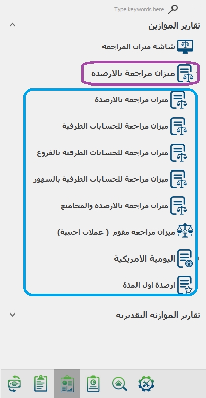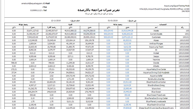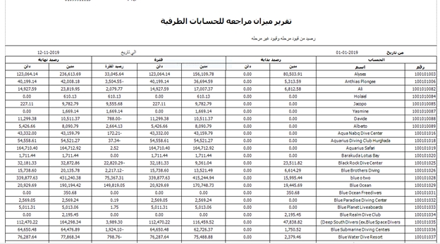 ميزان المراجعة عبارة عن ملخص الحسابات عن فترة معينة، ويستخدم أيضًا للتأكد من التوازن المحاسبي والذي لا يعني بالضرورة عدم وجود أخطاء في الحسابات وفى هذا التقرير يبين أرصدة الحسابات التى نتجت خلال الفترات التى تم إدخالها على البرنامج .