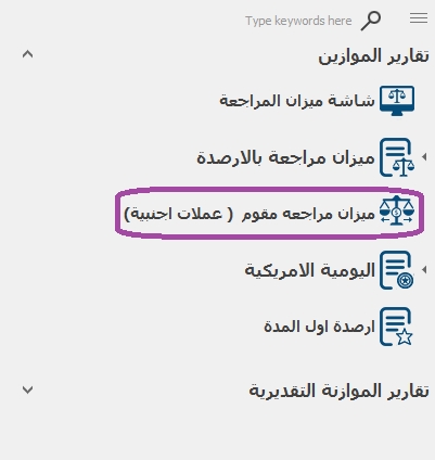من خلاله يتم الحصول على إجمالى أرصدة الأصول و الخصوم و الإيرادات و أيضًا المصروفات كحسابات رئيسية فقط أو بتفاصيل حساباتها الفرعية و هذا يتم تحديده من خلال المستوى كما سيتم توضيحه فى الصورتين :-