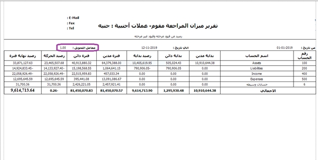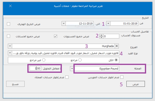 تحديد التاريخ (من - إلى) تحديد المستوى اختيار الفروع اختيار نوع القيود و يتم تحديد العملة و معامل تحويل العملة ثم عرض