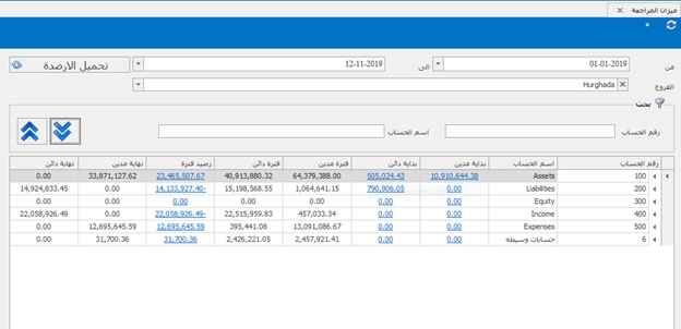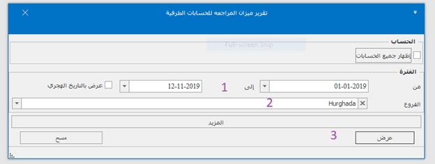 يمكن اظهار جميع الحسابات حتى التى برصيد = 0 أو لا -تحديد الفترة اختيار الفرع ثم عرض