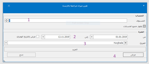 يمكن تحديد مستوى كم (0 إلى 5) - و يمكن اظهار جميع الحسابات - اختيار الفرع - ثم عرض