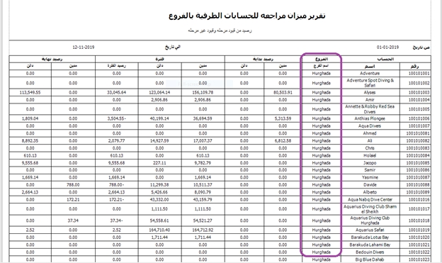 تقرير ميزان المراجعة للحسابات الطرفية بالفروع