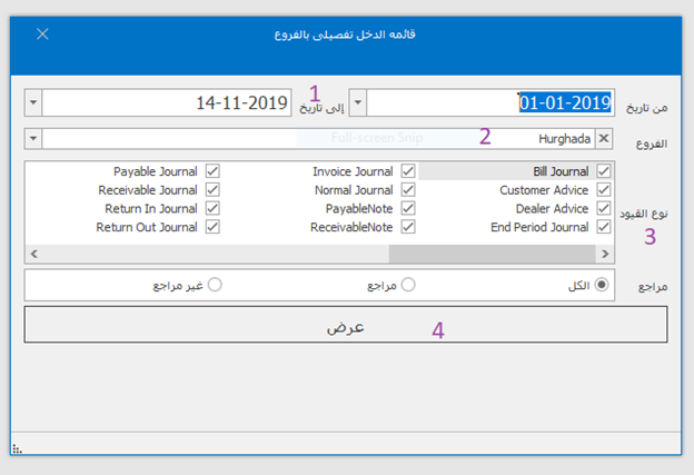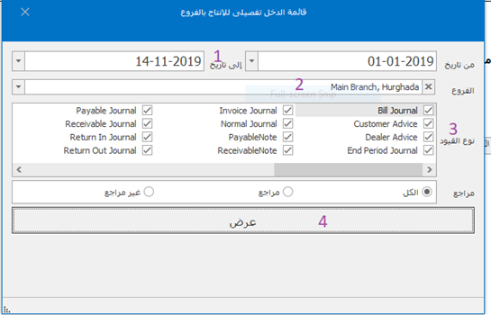 ادخال التاريخ (من - إلى) اختيار الفرع ثم تحديد نوع القيود ثم عرض