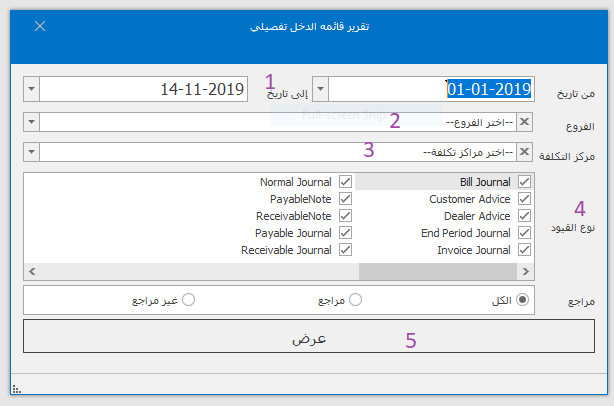 -ادخال التاريخ (من - إلى) -اختيار الفرع -ثم اختيار مراكز التكلفة -ثم تحديد نوع القيود -ثم عرض
