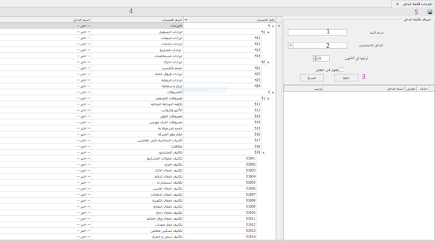 يمكن إنشاء بنود للدخل و هذه البنود يتم ربطها بالحسابات الموجودة فى شجرة الحسابات أولا :- يتم إنشاء البند أولًا من خلال- ادخال اسم البند إذا كان بند رئيسي , و بالتالى لن نختار الخانة الأخرى هى البند الرئيسي أما إذا كان البند فرعي و فأيضًا سندخل اسم البند , و لكن هذه المرة سنختار البند الرئيسي ثم حفظ . ثانيُا :- ربط الحسابات بتلك البنود اختيار كل حساب ببند الدخل الخاص به و أخيرًا حفظ