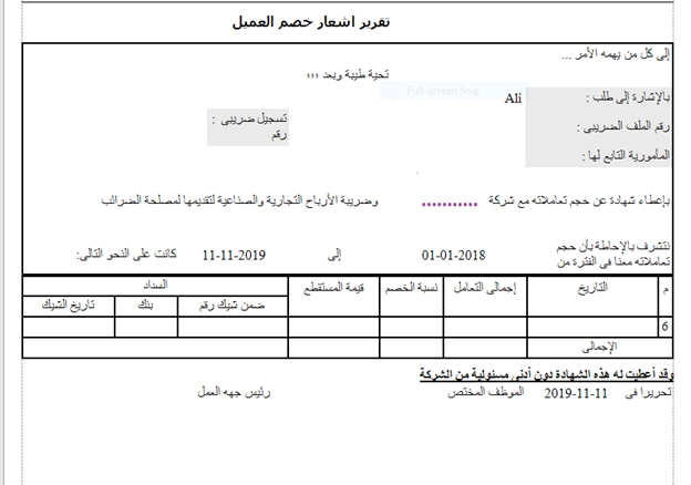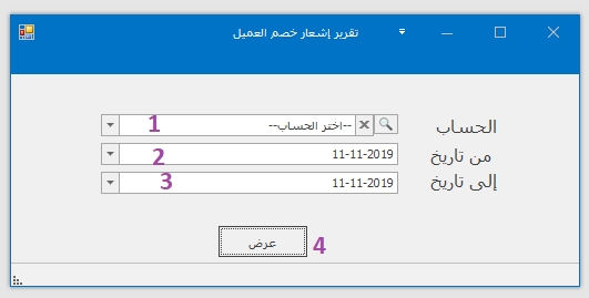 -:يوضح اشعارات الخصم التي تمت على العملاء من خلال ذلك التقرير و البحث بواسطة حساب العميل التاريخ (من) التاريخ (إلى) ثم عرض