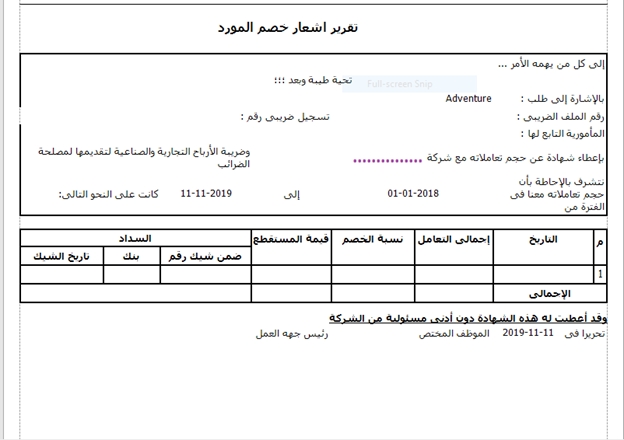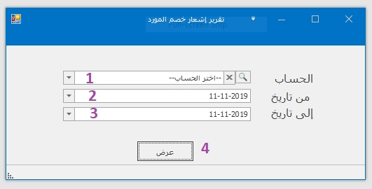 -:يوضح اشعارات الخصم التي تمت على المورد من خلال ذلك التقرير و البحث بواسطة حساب المورد التاريخ (من) التاريخ (إلى) ثم عرض