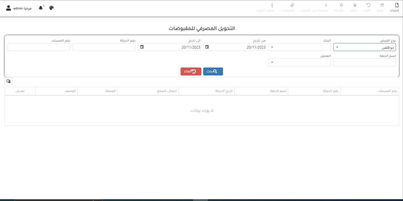 يتم البحث عن التحويل المصرفي للمقبوضات نوع موظفين بالخطوات التالية :-
