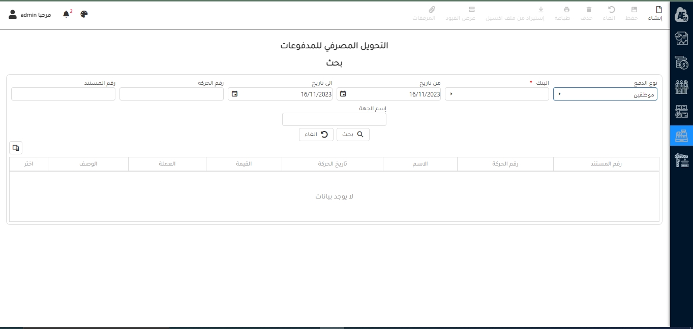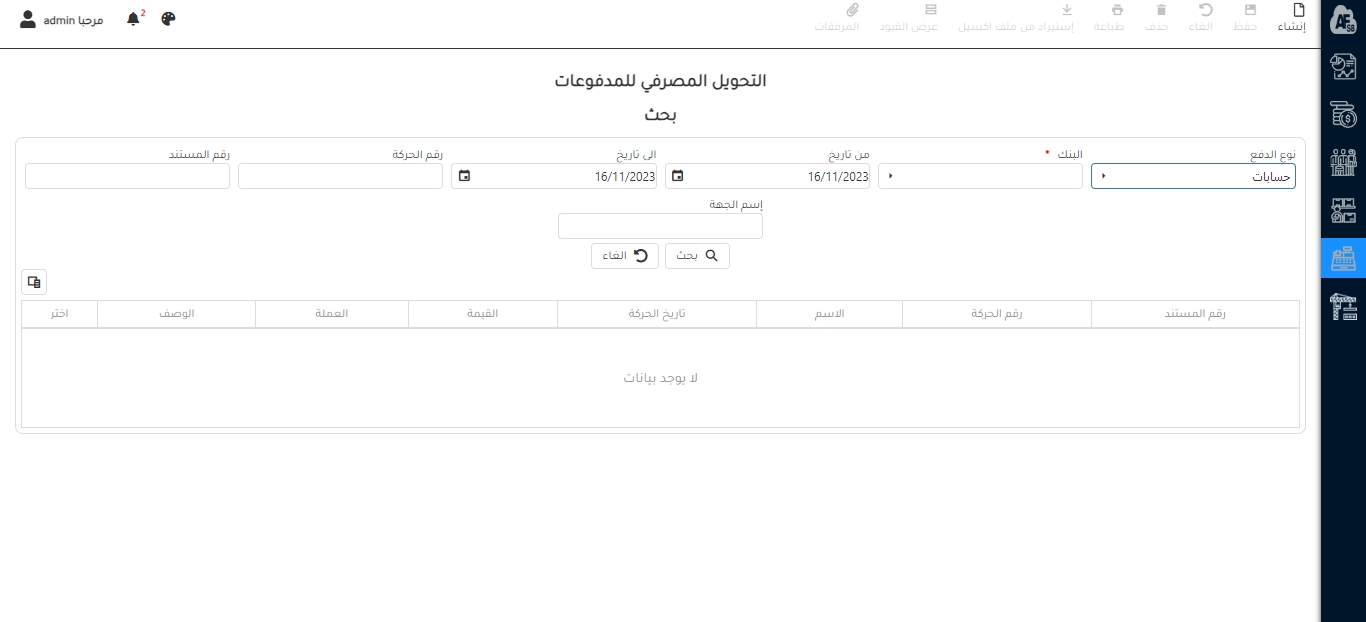 1-يتم اختيار البنك 2-يقدر يبحث عن تاريخ ورقم الحركة واسم الجهة