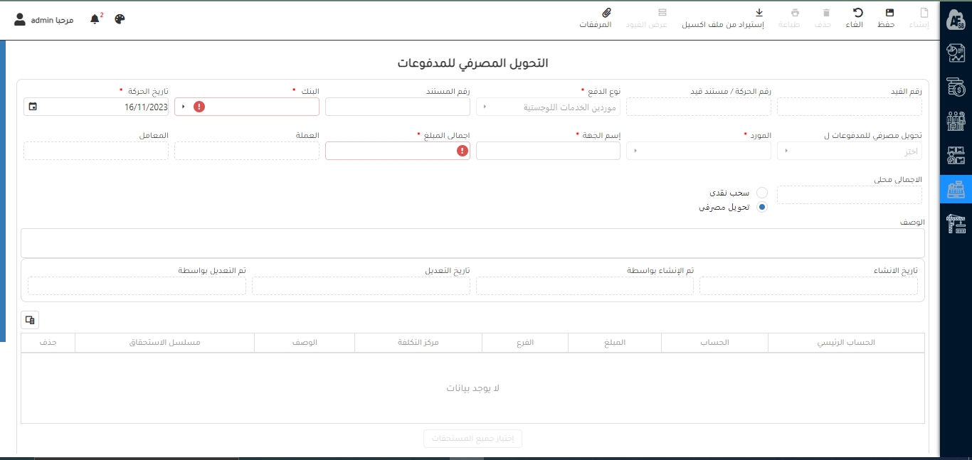 -يتم التوجيه الي شاشة التحويل المصرفي للمدفوعات نوع موردين لوجيستك ويتم ظهور حساب المورد اتوماتيكي في حالة عدم اختيار الحساب في الطلب نفسه ويطلب ان يتم اضافه فاتورة تخص المورد اذا كانت فاتورة اومرتجع مبيعات او امر توريداو رصيد بداية ويمكن اضافه حساب ايضا وادراج المبلغ الاجمالي مثل ما يحدث ف الشاشة الرئيسيه