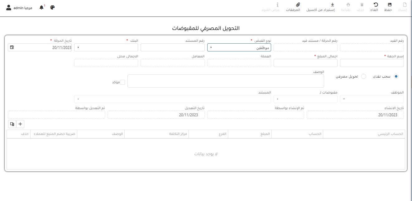 1-تظهر شاشة التحويل المصرفي للمقبوضات بالهيئه الخاصة بالحسابات وتظهر القيمه اتوماتيك و لا يمكن ان يغيرها ولا يغير في البنك و يمكن ان يغير الاسم ؛والوصف يظهر اتوماتيكي ف شاشة المقبوضات ويمكن ان يغيره