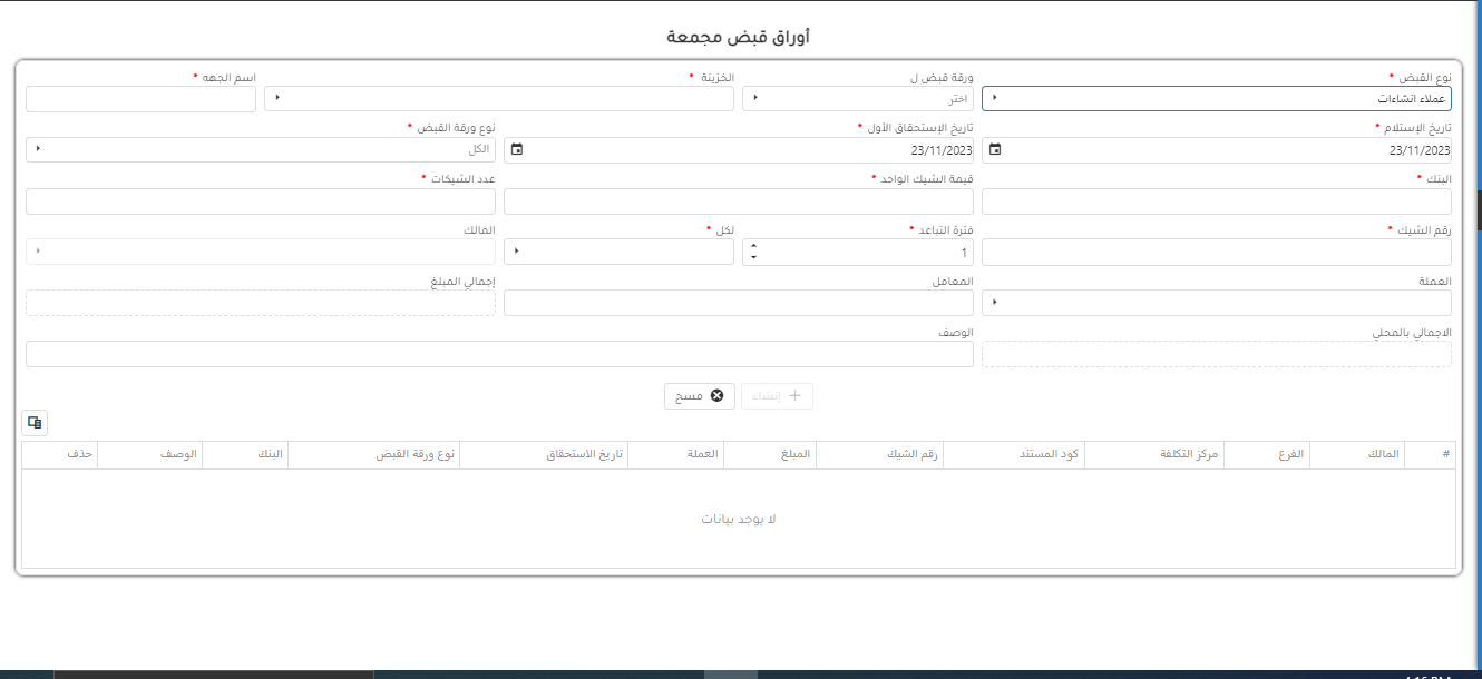 يتم انشاء اوراق قبض مجمعه نوع انشاءات بالخطوات التالية