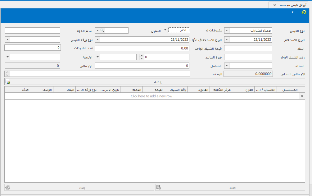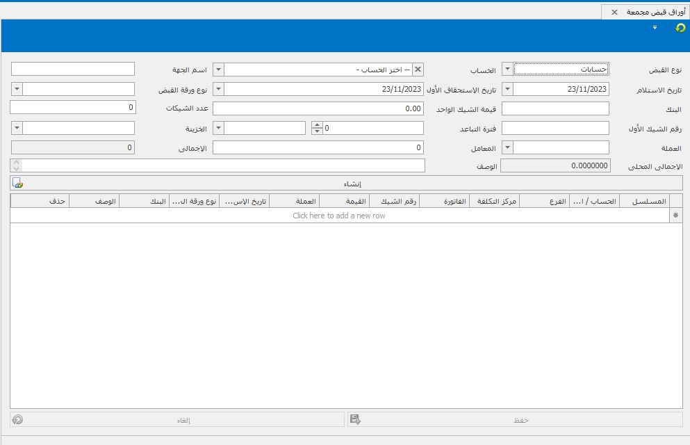 5- يتم كتابة قيمة كل ورقة قبض ويظهر الاجمالي اتوماتيكي معتمد علي عدد الشيكات