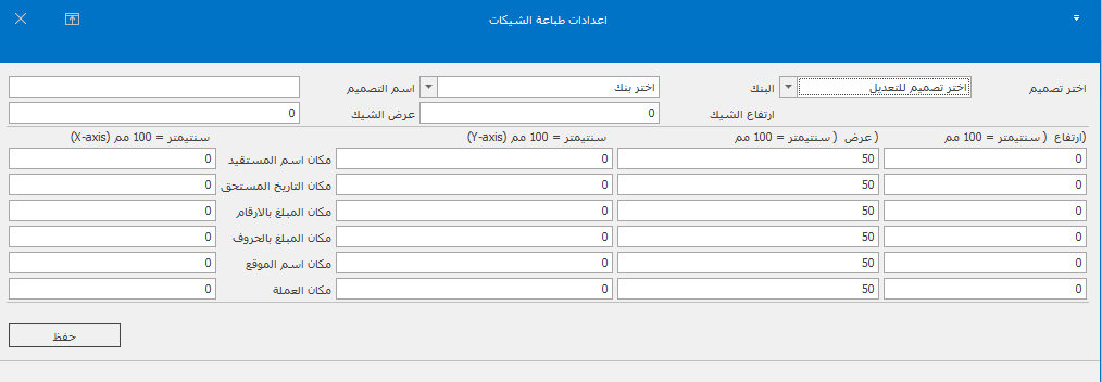 يمكن عمل إعدادات للشيك بالمقاييس التالية ووضع تصميم محدد للشيك لكي يتم اختياره في اوراق الدفع وطباعه الشيك الذي تم تصميمه