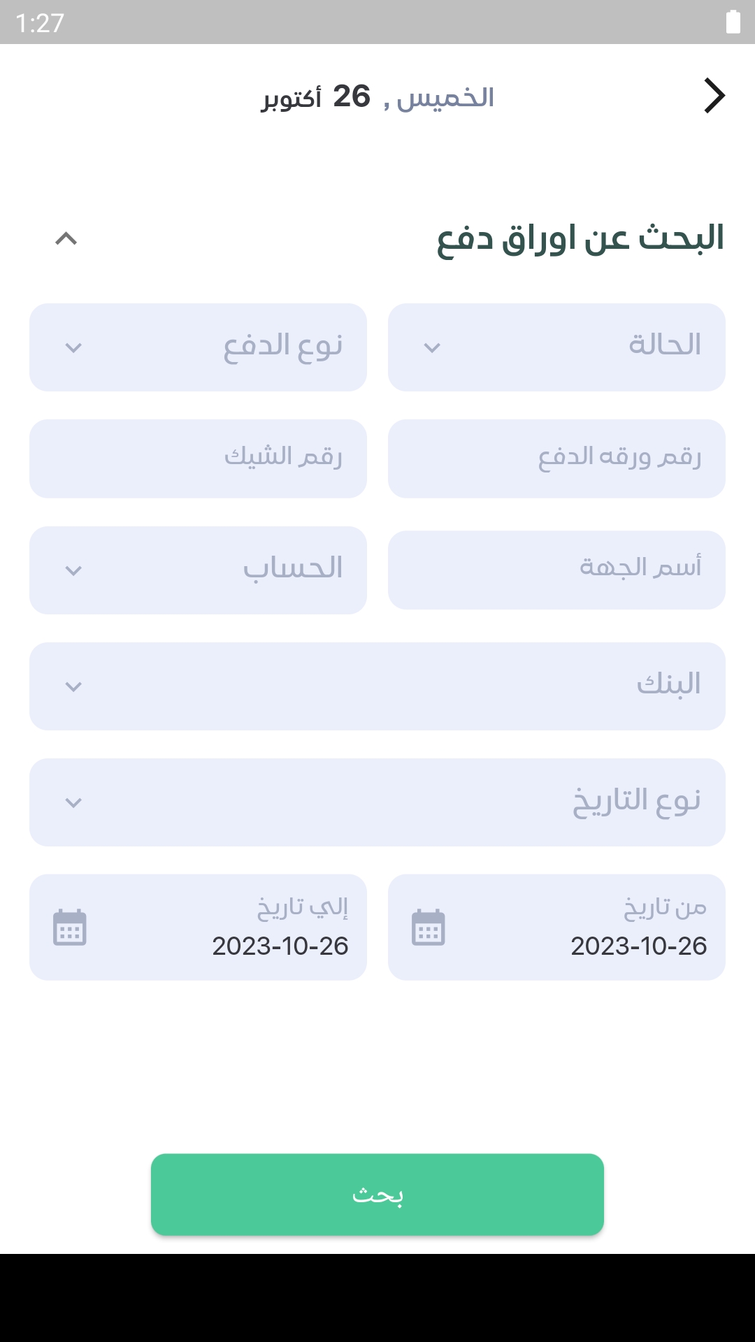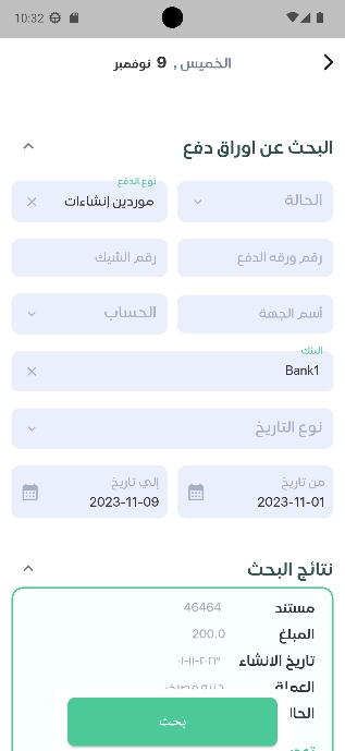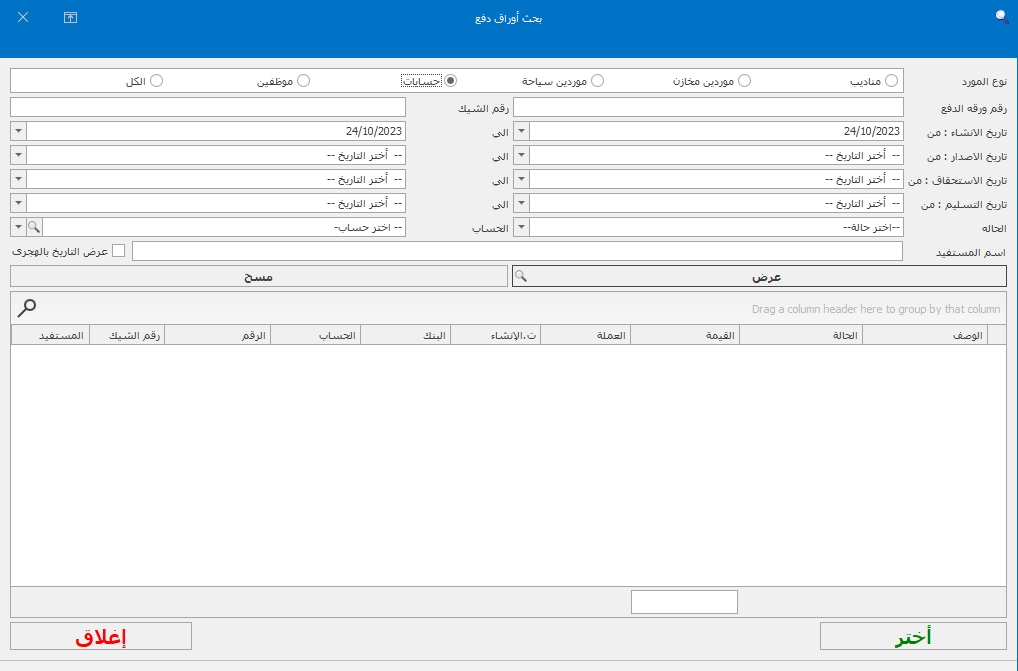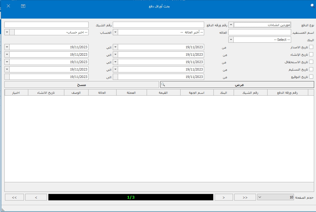 1-لبحث عن ورقه الدفع او رقم الشيك او الحاله او اسم الجهه او المورد او البنك