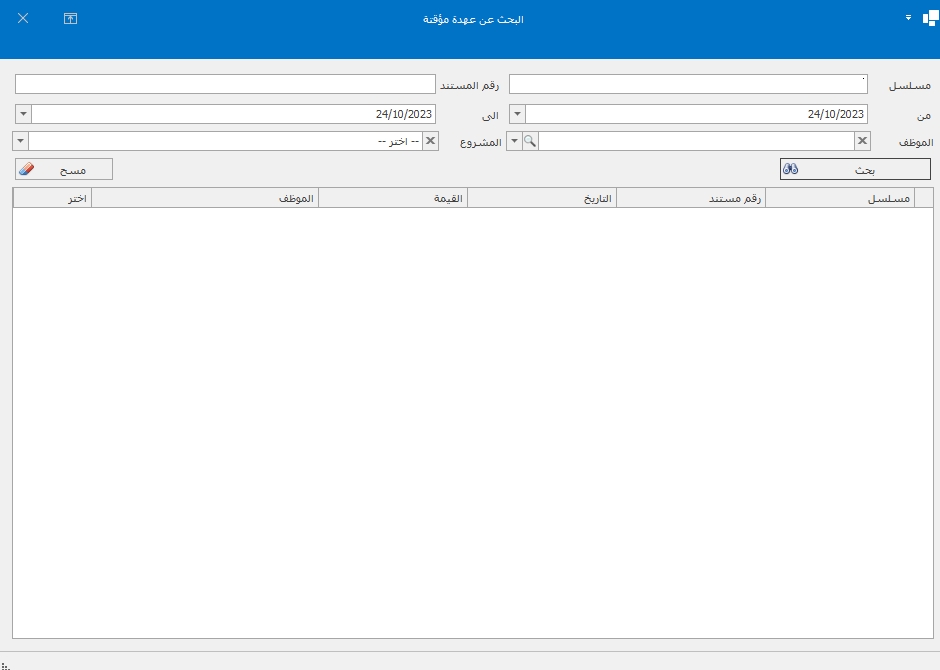 يتم ادخال الموظف والمشروع وفي حالة الرغبة يتم كتابه المستند والمسلسل