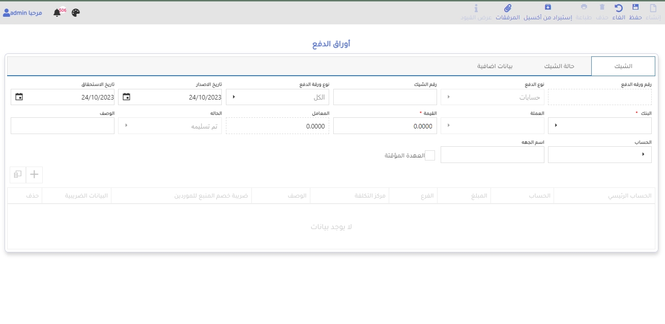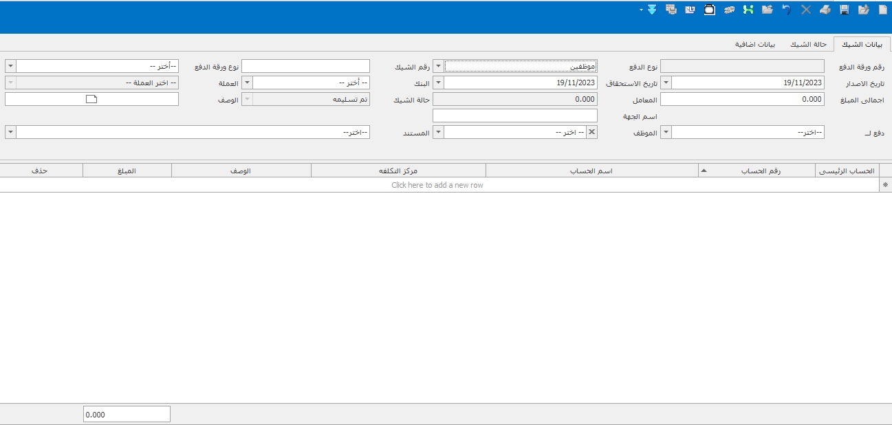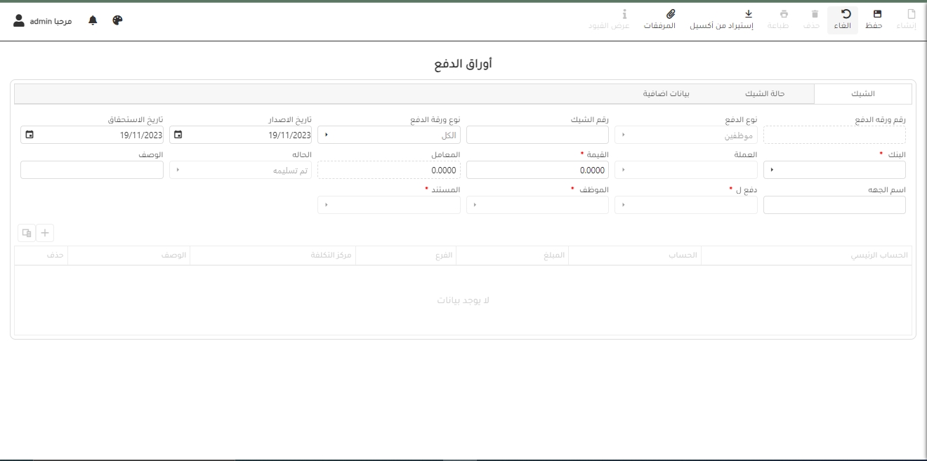 4-في حالة عمل ورقه دفع جديده و حالتها تم التسليم سوف يتم رمي القيد واذا كانت حالتها مثلا تم التوقيع لا ترمي قيد ولكن اذا كانت تحتوي علي ضريبة منبع او بيانات ضريبيه يجب التاكد انه يرمي قيد ضريبه المنبع