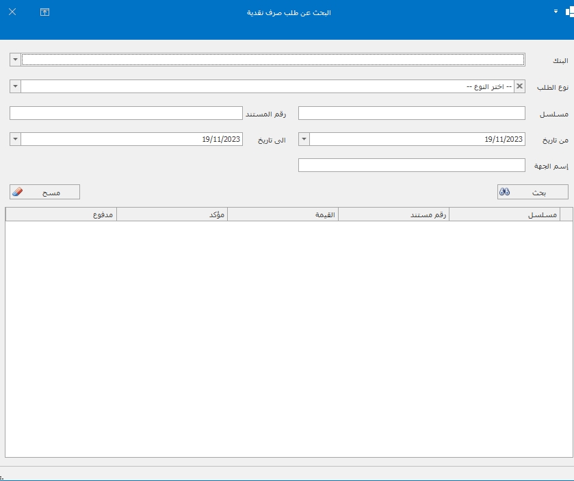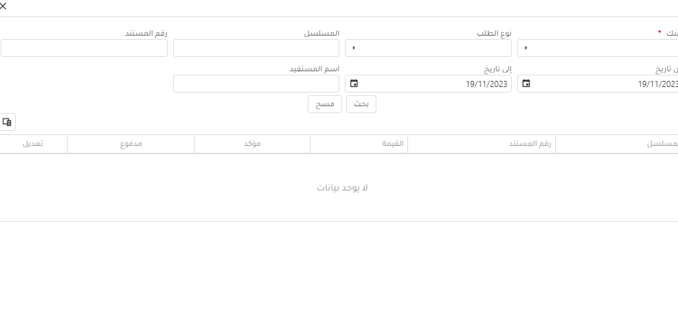 1-عنداختيار دفع من طلب صرف يظهرله شاشه البحث عن طلب الصرف