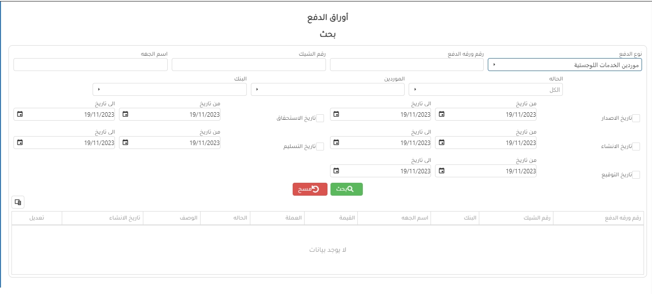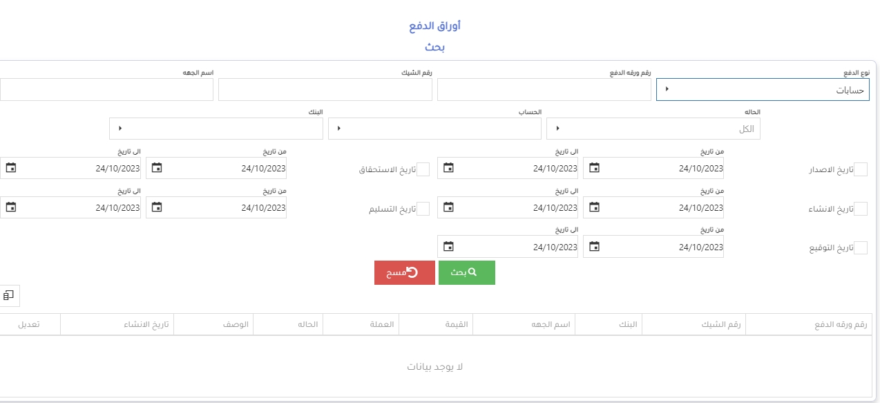 2- يمكن البحث عن تاريخ التسليم او الاستحقاق او بتاريخ الانشاء او الاصدار او كلهم مع بعض