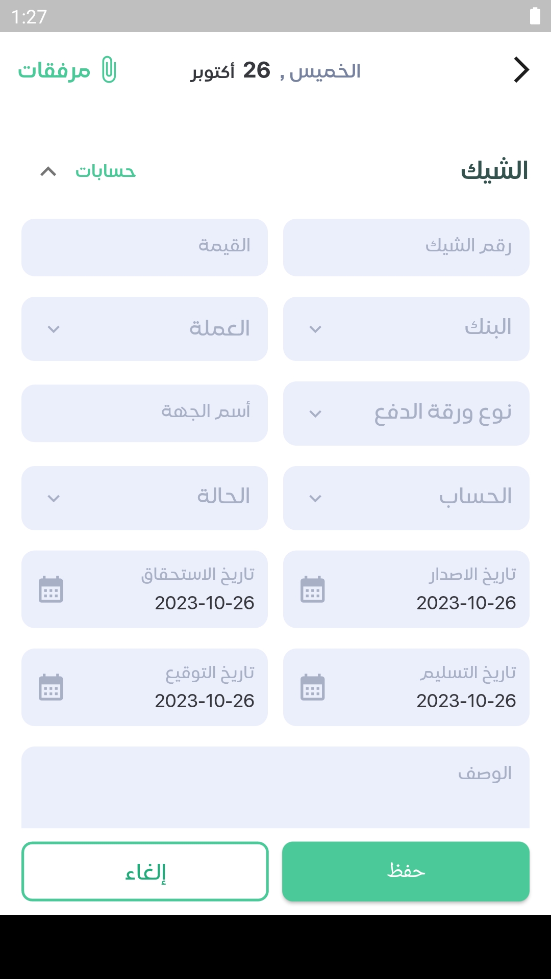 5-يكتب تاريخ الاصدار و تاريخ الاستحقاق و تاريخ الاستحقاق يجب ان يكون قبل تاريخ الاصدار ورقم الشيك
