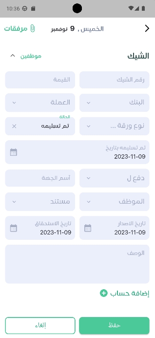 3-حاله الشيك يتم اختيار ما بين تم التسليم او تم التوقيع