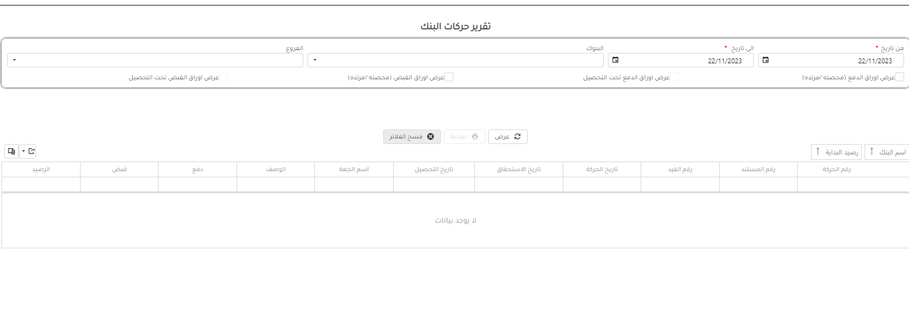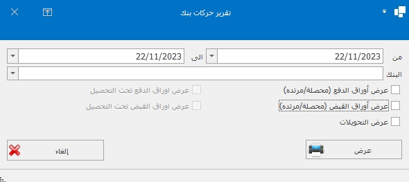 وهو تقرير يبين حركة بنك لكل من اوراق الدفع او اوراق القبض اوالتحويلات فى بيان واحد كما انه يوضح رصيد البداية ويتم البحث بالخطوات التالية