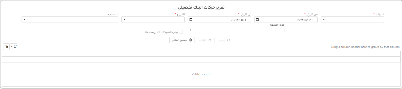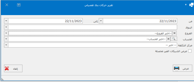 1-اختيار بنك او اكثر 2-يمكن اختيار فرع او اكثر 3-اختيار الحساب المربوط بالبنك وفي حالة اذا كان الحساب مربوط بمركز تكلفه يتم اختيار