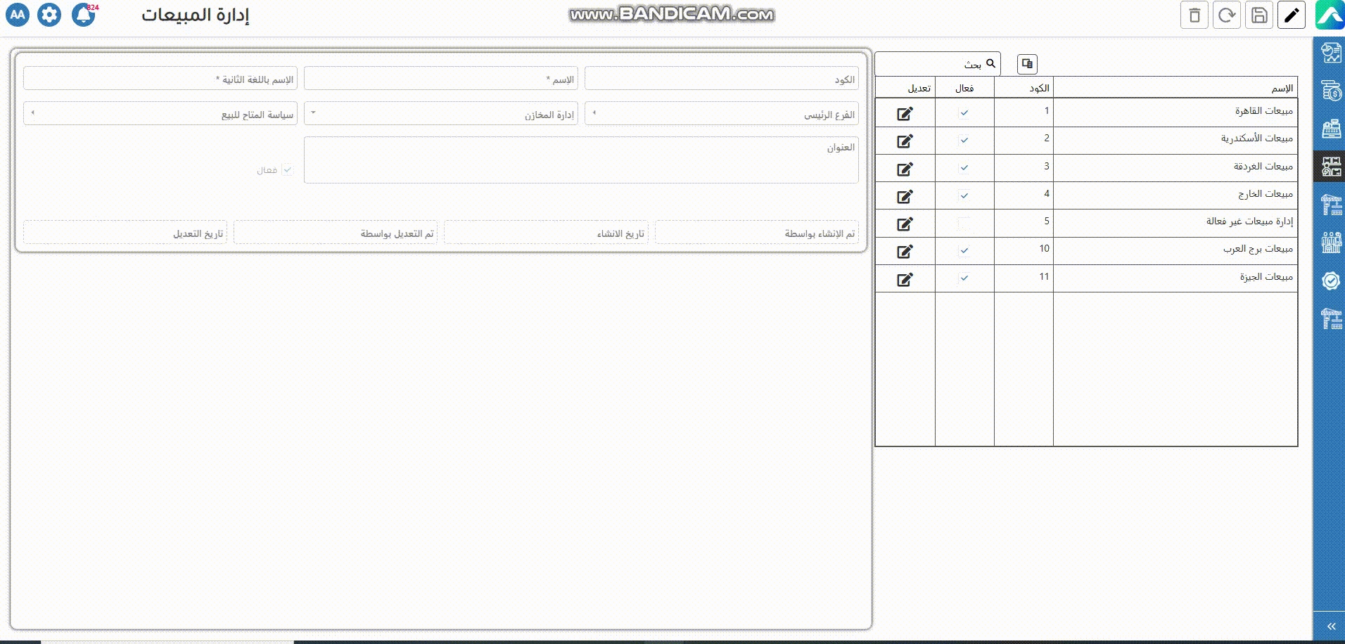 تم تصميم هذه الشاشة لتهيئة إدارات المبيعات داخل النظام، والتي تعتبر الجهات الرئيسية المسؤولة عن إدارة ومعالجة جميع العمليات المتعلقة بالمبيعات. ستتم دمج هذه الإدارات المحددة في جميع واجهات المعاملات داخل وحدة المبيعات لضمان إدارة متسقة للعمليات.