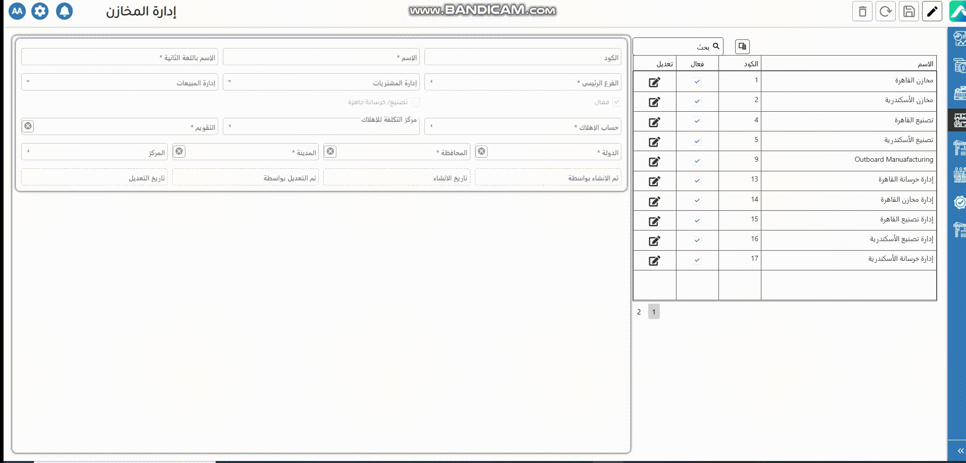 تُستخدم هذه الشاشة لتحديد المخزن، سواء كانت مخازن للتخزين أو للإنتاج. يبدأ المستخدم بإدخال اسم المخزن باللغتين الأساسية والثانوية، ثم يحدد الفرع الرئيسي المرتبط بالمخزن ويختار التقويم المناسب، بعد ذلك، يقوم بتعيين موقع المخزن من خلال تحديد الدولة و المحافظة والمدينة والمركز. وأخيرًا، يتم ربط حساب الإهلاك بالمخزن وتحديد مركز التكلفة المرتبط به لأغراض المحاسبة. يُتيح هذا الإعداد الشامل جميع التفاصيل اللازمة للإدارة الفعّالة للمخزن.