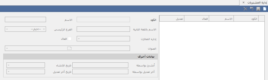 يمكن التعديل علي إدارة المشتريات من خلال اختيار الادارة الموجودة أمامك في الشاشة ويمكن التغيير علي الاسم والاسم باللغة الثانية والفرع وإدارة المخازن.