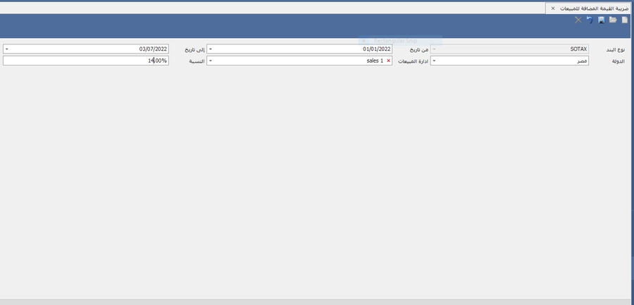 بعد اختيارهم يتم فتح الشاشة ويتم اختيار الدولة والفترة وادارة المبيعات ونسبة الضربيةوالضغط على حفظ