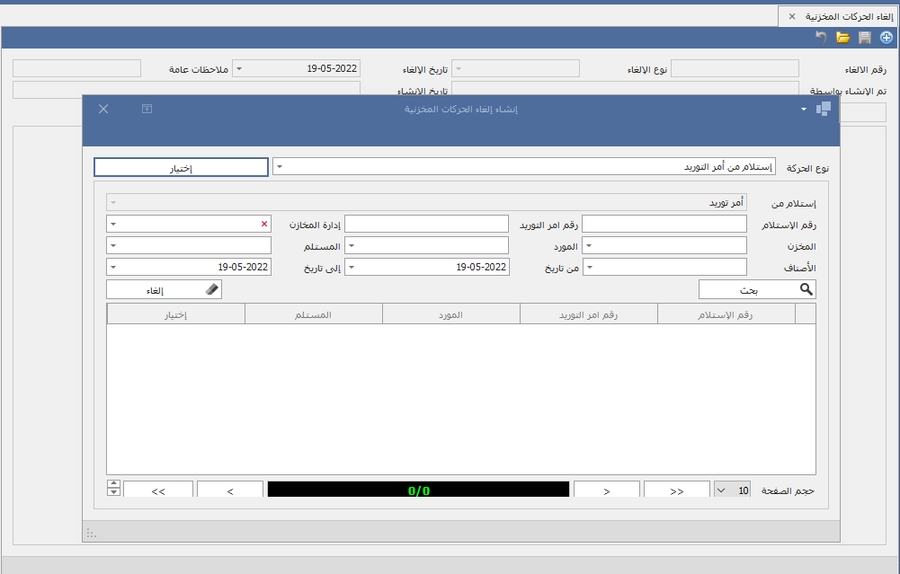 ويتم البحث عن المستند المراد الغاءه أو الغاء عدة أصناف منه، وعندما يتم اختياره فانه يتم استيراد البيانات الخاص به وظهور كل الاصناف الموجودة في الإستلام، ولا يتم التعديل عليها، وكا ما يقوم به المستخدم هو اختيار الاصناف المراد الغاءها وتحديد خانة الغاء بها، وفي حالة الرغبة في الغاء المستند بالكامل، فانه يتم الضغط علي زر الغاء الكل.