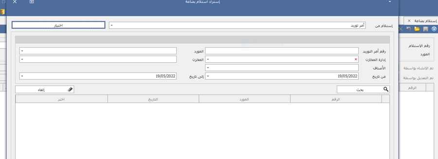 -عند اختيار النوع الاستلام امر توريد يتم فتح شاشة للبحث عن امر التوريد المراد عمل استلامة علية