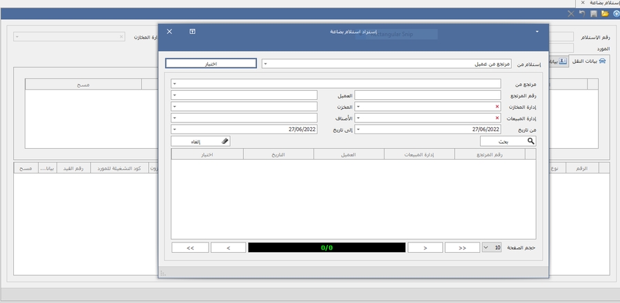 -عند اختيار النوع الاستلام من مرتجعات المبيعات يتم فتح شاشة للبحث عن المرتجعات المراد عمل استلامة علية