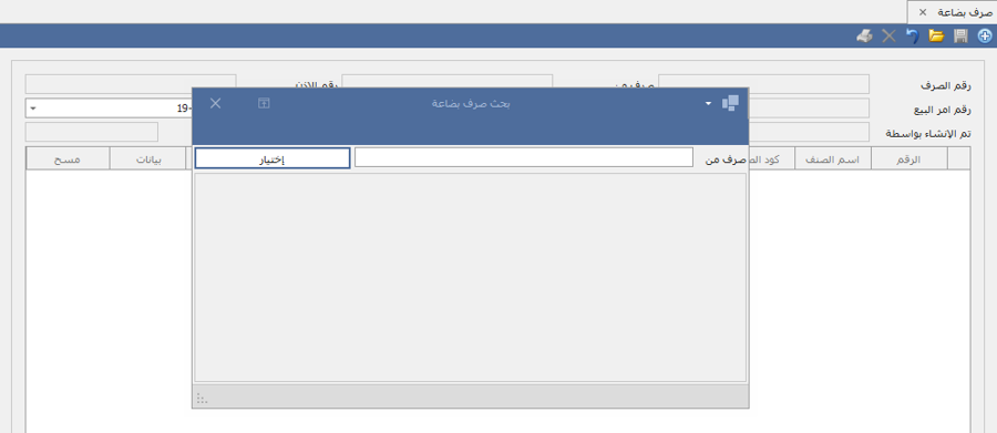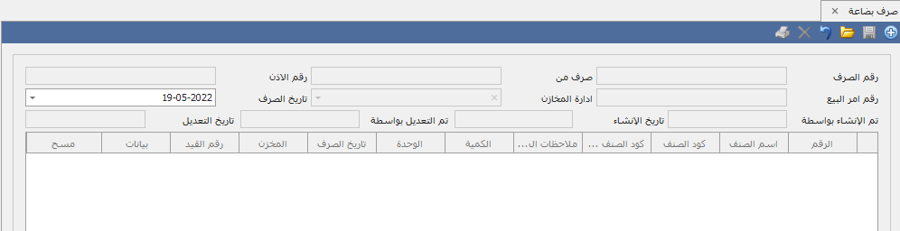 يتم صرف البضاعة من المخازن بناءا علي اذن صرف بضاعة عند إجراء عملية بيع من علي النظام. ويتم تحدي الكمية التي سيتم إخراجها من الصنف من أذن صرف البضاعة. ويتم في هذه الحالة إنشاء قيد ما بين حساب المخزون كدائن والحساب الوسيط كمدين.