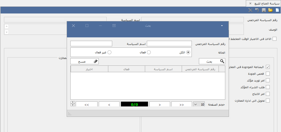 تختلف كل شركة عن الأخري في طريقة حساب الكميات المتاحه للبيع حسب طريقة العمل الداخليه للشركة، لذلك تم إنشاء شاشة مخصصه لإنشاء السياسات التي تناسب الشركة.