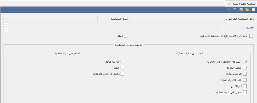 يتم من خلال سياسة المتاح للبيع تحديد الطريقة التي سيقوم النظام من خلالها التوقع بتوفر كميات الصنف في أمر البيع في التاريخ المطلوب.