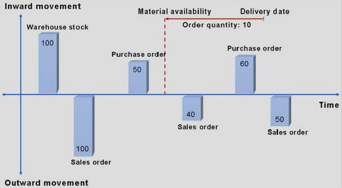 أي أن النظام سيقوم بشكل الي (في حالة تفعيل نظام سي) بحساب الكمية المتوفره عند إنشاء الأمر كمية 100 قطعة في المخزن وسيتم سحب بعدها 100 قطعة لأمر بيع، وسيتم بعدها زيادة الكمية من خلال أمر توريد ب 60 قطعة، فإذن سيكون متاح عندها إخراج ال 10 قطع في هذا التاريخ.