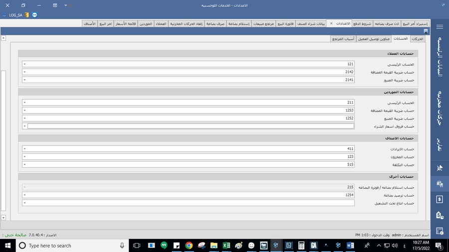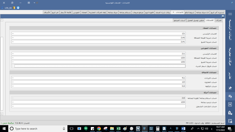 فى هذه القائمة يتم اختيار حسابات رئيسية للعملاء والموردين والاصناف عند انشاء اى منهم يتم ظهور الحساب افتراضى فى خانة الحسابات الرئيسية وعند الحفظ السيستم ينشا حساب تحت الحساب الرئيسى الذى تم اختيارة من شاشة الاعدادات
