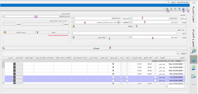 تعتبر هذه الشاشة من الشاشات الرئيسية فى البرنامج بحيث يظهر من خلالها وقت حضور و انصراف الموظفين و بعد اعتماد المرتب تظهر قيم الجزاءات نتيجة ساعات العمل الإضافية وساعات العمل و الانصراف و أيام الحضور و الغياب . و يتم معرفة وقت الحضور و الانصراف بهذه الطريقة :-